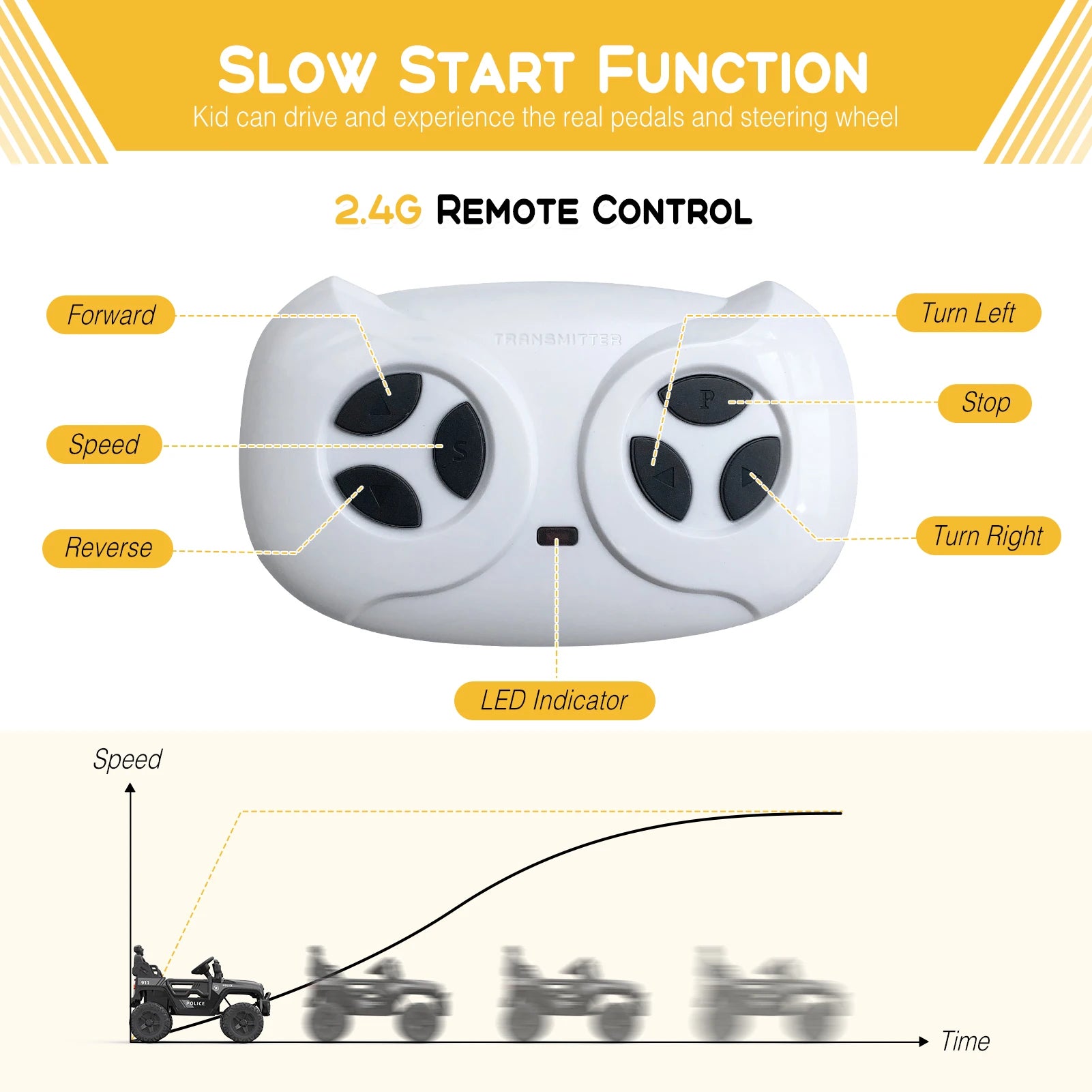 Wireless Music: This product connects to Wireless Music allows parents to choose from a wide range of music while driving. The remote control manually has three speeds: high, medium and low (remote control priority, slow start function, one-touch brake function).